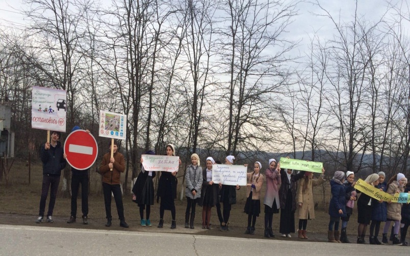25.02.2016Согласно плану школы и с целью профилактики правонарушений в МБОУ "Гикаловская СОШ" на выезде из п.Гикало учащимися 5-11 классов и инспектором ПДН Тимаевым А.А. 25.02.2016г. проведен флешмоб «Тише едешь-дальше будешь». Трафареты, плакаты, знаки дорожного движения наглядно показывали проезжающим водителям автомашин , что хотят участники этой акции.