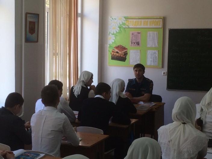 28.09.2016Представителями МЧС капитаном внутренней службы старшим инспектором ОНД и ПР по Грозненскому району Орцуевым С.М. и лейтенантом внутренней службы инспектором ОНД и ПР Хабибовым М-А.У проведена беседа с учащимися 9-х классов антитеррористической направленности на тему «Предупрежден- значит вооружен»