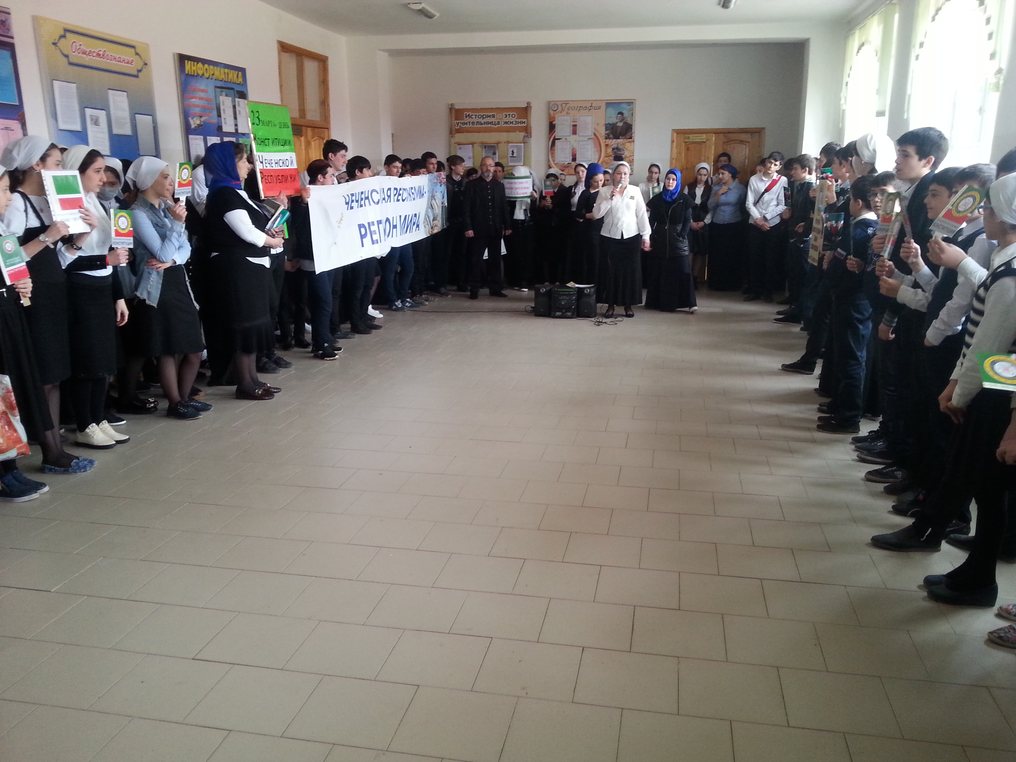 20 марта 2017 проведена торжественная линейка в среднем и старшем звене, посвященная Дню Конституции Чеченской Республики «Конституция –всему основа!» Торжественная линейка началась с исполнения гимна Чеченской Республики. В праздничной линейке участвовали учащиеся 5-11 классов. Оформление: баннер «Чеченская Республика-регион мира», трафареты, флаги РФ и ЧР. Цели: формирование гражданской позиции, укрепление чувства патриотизма и национальной гордости; формирование навыка оценки политических событий и процессов в обществе, потребности в выполнении конституционного долга; воспитание и развитие личностных компетенций.
