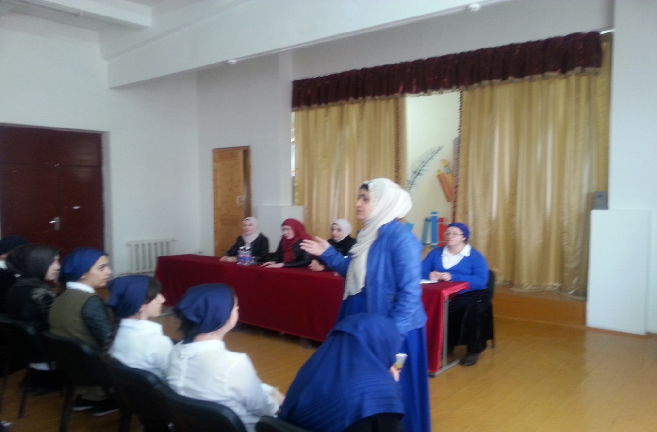 10.10.2015В МБОУ «Гикаловская СОШ» 10.10.15 в актовом зале состоялась беседа членов Чеченской региональной общественной организации «Иман» с ученицами 9-11 классов. Направление: духовно-нравственное воспитание молодежи ЧР. Тема беседы « Девушки в Исламе». Присутствовали члены ЧР ОО: Гойгишиева Захра Хадушкаева Аза Батукаева Румани Вахаева Сальва Решидова Суряна Директор школы Гелаева Р.Ш. Заместители директора по ВР – Дашаева З.Б. Цунцаева М.Н.