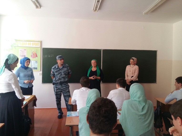 08.09.201508.09.2015 г инспектором ПДН ОМВД по Грозненскому району, майором полиции Тимаевым А.А. , совместно с зам. директора Дашаевой З.Б.., социологом Сусуровой Л.М. и психологом Насухановой З.Ш. МБОУ «Гикаловская СОШ», провели профилактические беседы с уч-ся 10-11 классов в рамках профилактического мероприятия под условным названием «Полиция на страже детства» на тему « Профилактика терроризма и экстремизма в молодежной среде » (духовно-нравственное воспитание молодежи).